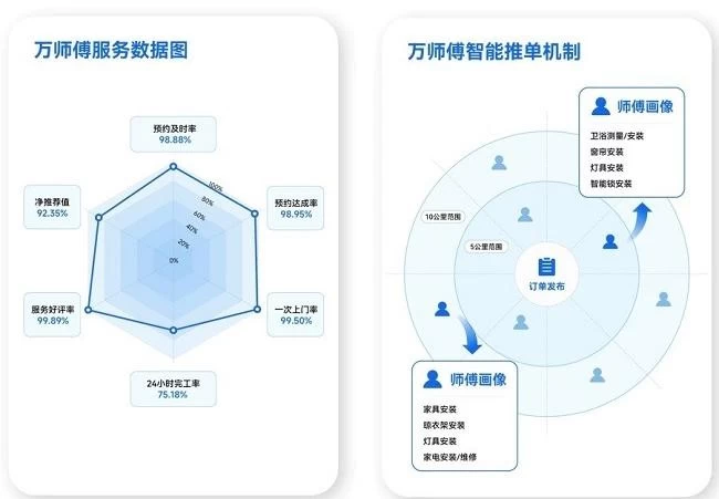 基于万师傅智慧管理系统,用户能够直观监测师傅服务进度,确保服务时效。与此同时,万师傅智能推单系统将多元化用户需求实时推送给技能匹配的师傅,在最短时间内实现供需双方的精准对接,省略人工查询及匹配的过程。