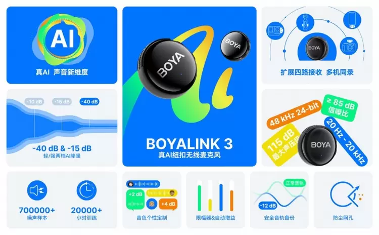 2025年5月14日,知名国产声学设备品牌 BOYA博雅,发布了两款革新性产品——真AI无线麦克风旗舰 BOYAMIC 2与真AI纽扣无线麦克风 BOYALINK 3。作为品牌年度重磅之作,两款产品均搭载 BOYA博雅自主研发的“AI深度降噪3.0”技术,以-40dB行业顶尖降噪深度、70万+噪声样本数据库及毫秒级实时处理能力,重新定义了无线麦克风的性能标准。此次发布不仅标志着 BOYA博雅在智能音频领域的又一里程碑,更预示着AI降噪技术正成为行业升级的核心驱动力。