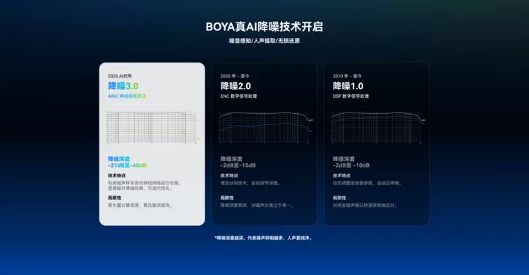 博雅MIC 2与博雅LINK 3的核心技术都基于BOYA的AI降噪3.0技术体系,包括以下三大关键突破: