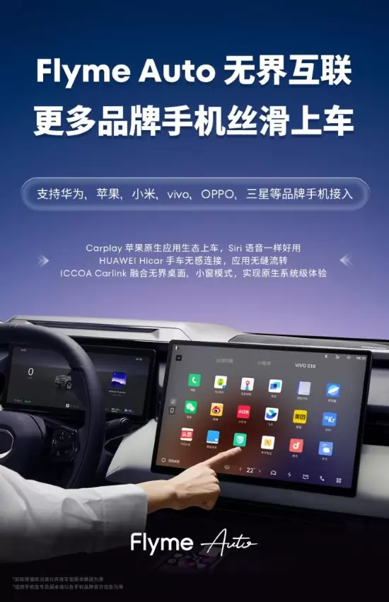 同时,星纪魅族创新性提出“手机域”理念,实现手机与车机的无缝连接、生态共享和能力共享,支持魅族、华为、苹果、小米、vivo、OPPO、三星等多品牌手机接入,更实现了 Carplay、HUAWEI HiCar、ICCOA Carlink 等多种生态的无界互联,为用户打造了流畅、智能、生态丰富的出行体验。