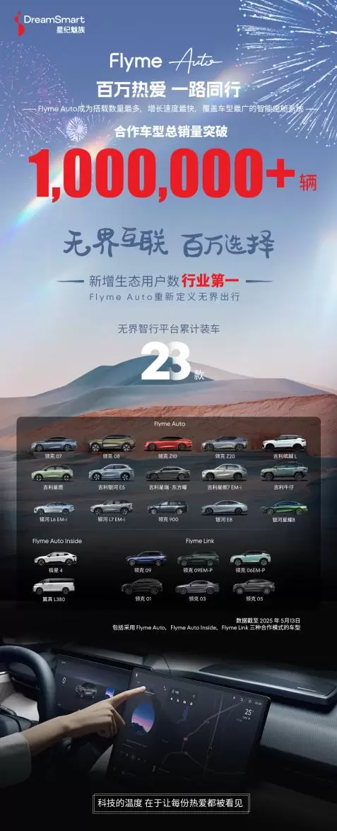 统计数据显示,近半年来,平均每天有 3670 名车主成为 Flyme Auto 用户,其中既包括新购车用户,也包括银河 L6、L7 已购车用户的系统升级。在新老车主用户的共同支持下,Flyme Auto 上车辆增速持续拉升,今年 5 月合作车型累计销量突破百万,实现跨越式增长。