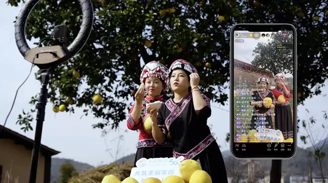 在桃子岔村,果农们通过中国移动5G直播,向网友推介贡水白柚