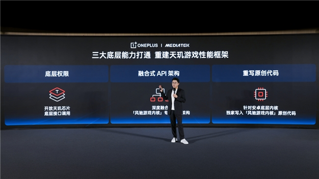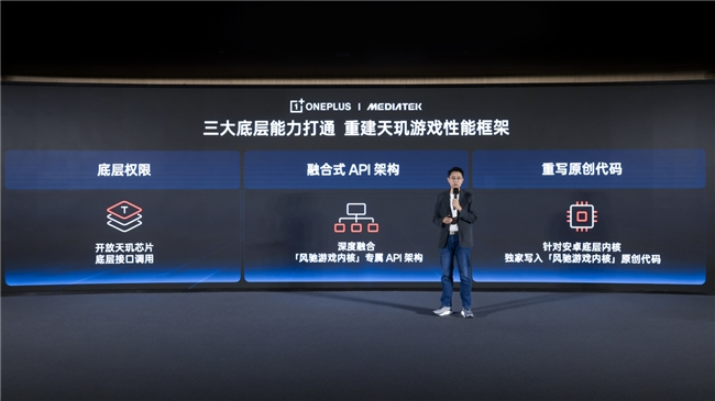 此次一加与联发科技携手打通三大底层能力,首次将风驰游戏内核首次写入天玑平台,彻底重构芯片底层内核,重建天玑游戏性能框架。首先,一加借助联发科技开放芯片底层调用权限,让一加自研的超帧超画引擎更高效利用芯片CPU、GPU与缓存,大大提升计算效率;同时,风驰游戏内核还与联发科技的星速引擎融合,定制一加独占 API 与长期演进架构。最终,双方针对安卓底层内核与游戏渲染管线,重写原创代码,重构芯片底层内核,打造出一加独有的天玑芯片游戏性能框架,为天玑芯片注入「电竞核」,让天玑芯片游戏表现也能「开了挂」。