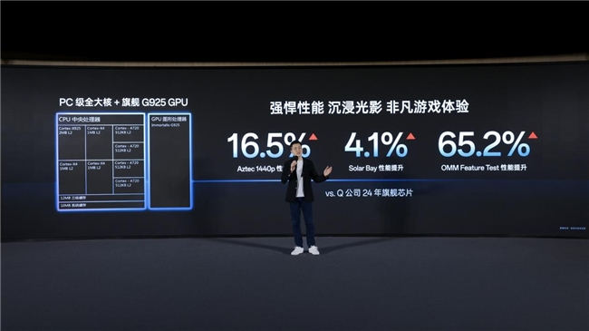 联发科技无线通信事业部总经理李彦辑在发布会上表示,联发科技28年来始终深耕芯片领域,仅在2024年研发投入占比就高达25%,并且自从2020年第三季度以来,联发科技已连续18个季度稳居全球智能手机芯片市场首位。不仅如此,过去几年里天玑旗舰芯片以非凡的性能表现也获得了越来越多头部厂商和用户的认可。刚刚发布的天玑9400+芯片凭借PC级的全大核架构、旗舰级GPU G925、全面领先的计算架构和业界最强的图像计算引擎共同打造了卓越游戏性能表现。在游戏生态方面,联发科技与头部主流100家游戏工作室进行了全面深度合作,为玩家带来绝佳游戏体验。发布会上,李彦辑发布联发科技与一加联合打造的全新天玑9400旗舰家族新成员9400e,天玑9400e拥有“4超4大”旗舰全大核CPU架构,同档最大缓存配置,还搭载了旗舰12核GPU G720,拥有强大的图形性能。凭借着强悍的全大核设计,天玑9400e的CPU多核性能大幅领先友商次旗舰芯片和前代旗舰芯片,性能表现同档领先。天玑9400e将会在即将发布的一加 Ace 5至尊版上全球首发。