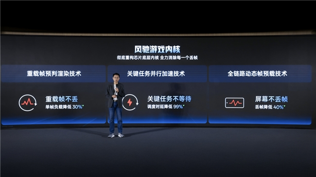 风驰游戏内核通过彻底重构芯片底层内核,运用三大技术能力全力消除每一个丢帧。首先是重载帧预判渲染技术,通过风驰游戏内核显著降低单帧的负载30%,同时又叠加了重载帧预感知能力,提前分配好算力,让关键重载场景也不丢帧。其次,利用关键任务并行技术,通过全局统一的调度策略,降低了关键任务的调度时延99%,让关键任务顺畅执行。最后,通过权力路通过全链路动态帧预载技术,显示丢帧大幅降低40%。