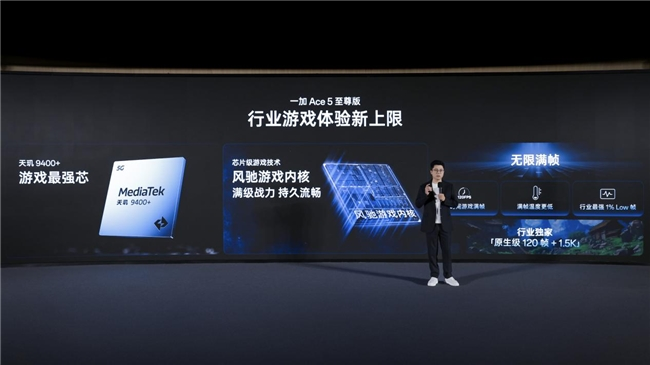 2024 年 5 月 14 日,一加联合联发科技举办主题为 “芯旗舰 新上限” 的游戏战略沟通会。一加与联发科技强强联合成立游戏联合实验室,首次将芯片级游戏技术风驰游戏内核写入天玑平台,并联合联发科技首发专为游戏而生的天玑9400旗舰家族新成员9400e。会上,一加中国区总裁李杰宣布:即将发布的一加Ace 5至尊系列采用天玑9400+和天玑9400e双旗舰平台,凭借风驰游戏内核加持,挑战行业最强1%low帧表现,带来行业游戏体验新上限。