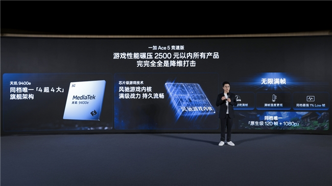 一加中国区总裁李杰宣布,一加天玑双旗舰,游戏体验双至尊的一加 Ace5 至尊系列即将发布,出厂即写入风驰游戏内核,实现平均帧率最高+行业最优 1%Low 帧。同时李杰呼吁所有厂商,除了平均帧率也要同时做好 1% low 帧,为用户打造真正好的游戏体验。一加 Ace 5 至尊版搭载天玑 9400+和风驰游戏内核,拥有独家的无限满帧、最强 1% low 帧表现,独家原生级 120 帧游戏体验,将成为目前行业游戏体验的新上限。一加 Ace 5 竞速版,全球独家首发注入风驰游戏内核的天玑 9400e,游戏性能降维打击,碾压所有2500元以内的产品。