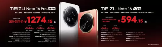魅族 Note 16 参与百大职业专项补贴后, 8GB+128GB 版本售价 699 元(国补价 594.15 元)、8GB+256GB 版本售价 899 元(国补价 764.15 元)、12GB+256GB 版本售价 1099 元(国补价 934.15 元)。魅族 Note 16 Pro 8GB+256GB 版本售价 1499 元(国补价 1274.15 元)、12GB+256GB 版本售价 1699 元(国补价 1444.15 元)、12GB+512GB 版本售价 1899 元(国补价 1614.15 元)、16GB+512GB 版本售价 2099 元(国补价 1784.15 元)。