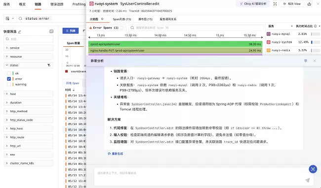 系统出现错误时,传统的日志分析往往需要人工逐条排查,效率低下。观测云的AI错误分析功能能够自动扫描日志、链路等,识别并分类错误信息,提供详细的错误原因分析,帮助用户迅速定位问题根源。