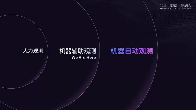 传统的可观测性依赖于人工设置和监控,效率低下。观测云通过引入 AI,实现了从人为观测到机器辅助观测的转变。这一进化大大提升了系统的自我诊断和自我修复能力,减少了人为干预的需求。 未来,我们更希望可以继续演进到机器自动观测,提升更多的生产力。