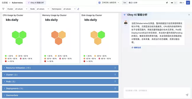 Obsy AI 能够根据当前仪表板中的数据进行智能分析,识别关键指标的异常变化,帮助用户进行问题洞察以及预测。用户可以与 Obsy AI 进行对话,快速定位问题,实现动态交互。