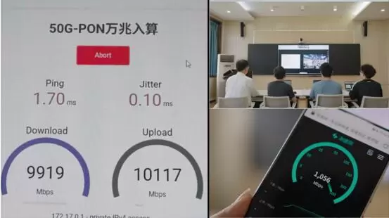 科研场景提质增效:在水资源工程与调度全国重点实验室,50G-PON万兆光网有力支撑高性能科研实验海量数据的实时采集与极速传输,保障科研大模型数据极速入算武汉大学超算中心,为分布式计算和人工智能大模型拉远训练/推理提供坚实的网络支持。相较于传统千兆网络,50G-PON万兆光网入算效率上提升10倍,上行与下行峰值速率均突破了万兆大关,时延低于0.1毫秒。