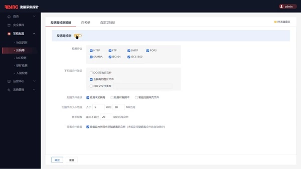 瑞星NDR支持针对协议识别、反病毒、IoC 检测、挖矿检测、入侵检测进行个性化配置,以反病毒和IoC检测为例:
