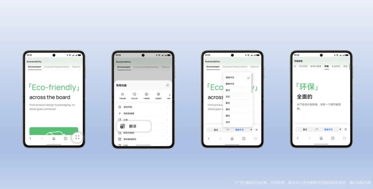 当你浏览网页时,首次使用需点击界面右下角“四个点”,在常用功能菜单中选择“翻译”,翻译组件即会弹出,选择要翻译的目标语言,整个网页将即时翻译,大大提高了网页浏览效率,优化操作体验。首次使用后,翻译组件会保持在页面下方,方便后续浏览新的页面时进行翻译。