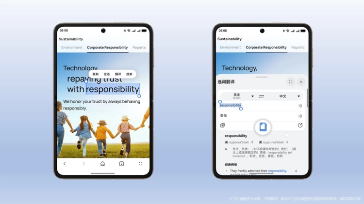 当你浏览网页时,只需长按页面,选取相应文字段落,屏幕会即刻出现快捷组件,点击“翻译”功能,就会呈现精准译文,大大提高了资讯获取效率。