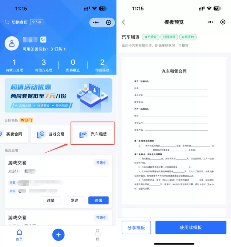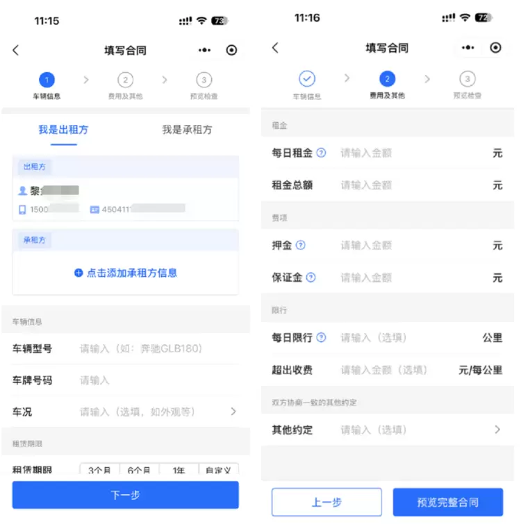 ·简化填写流程:发起方只需输入车牌号、租赁期限、押金金额、双方身份信息,系统自动将内容匹配至模板对应位置;