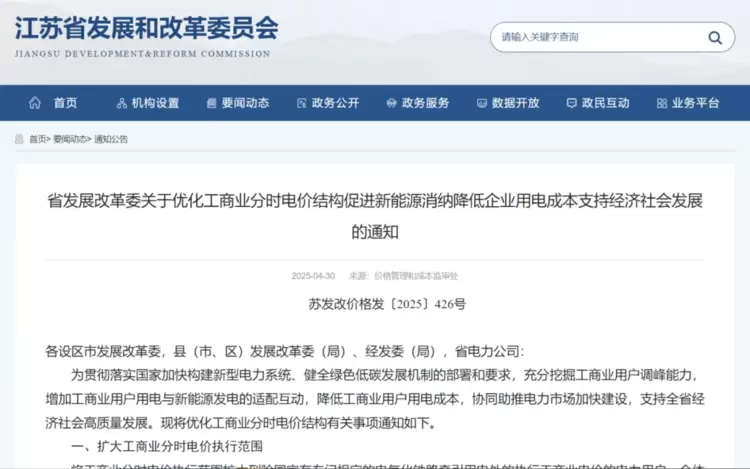 在“双碳”目标与新型电力系统建设的双重驱动下,近日,江苏省发展改革委正式发布《关于优化工商业分时电价结构促进新能源消纳降低企业用电成本支持经济社会发展的通知》(苏发改价格发〔2025〕426号),通过扩大分时电价覆盖范围、新增午间谷段电价、优化峰谷浮动比例等举措,为工商业用户释放电价政策红利,同时为储能产业注入强劲发展动能。