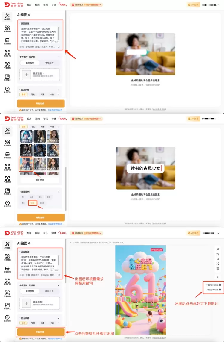3. 一键出图:点击出图按钮,等待几秒,专属海报即刻生成。如果对生成的海报不满意,还能随时调整关键词,再次重新生成,直到达到理想效果。生成后的图片点击即可下载,方便快捷。