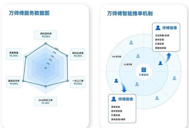 基于万师傅自主研发的智慧管理系统,用户能够直观监测师傅服务进度,确保服务时效。与此同时,万师傅智能推单系统将多元化用户需求实时推送给技能匹配的师傅,在最短时间内实现供需双方的精准对接,省去人工匹配与沟通流程。