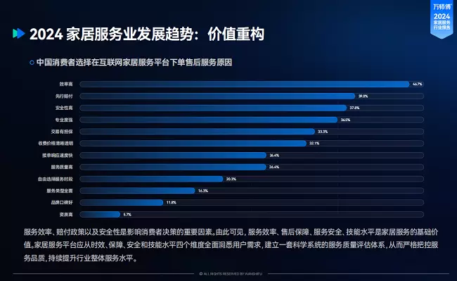 《2024家居服务行业洞察报告》指出,效率高、先行赔付、安全性高是我国消费者选择互联网家居服务平台解决需求的主要原因。