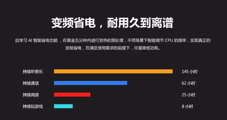 除了电容量大,摩托罗拉p30 note还支持AI能变频省电技术,更大幅度的提升了这部手机的续航能力。根据官方数据统计,摩托罗拉p30 note的可持续通话62小时,持续听音乐145小时,持续玩游戏8小时。