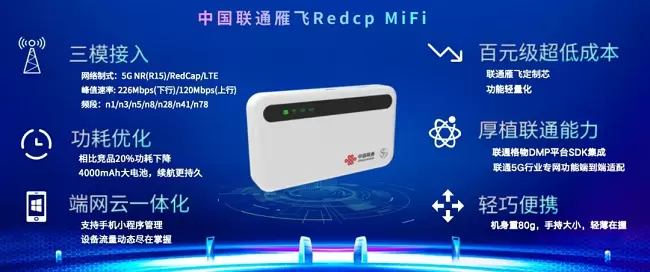 为解决当前移动网络场景中普遍存在的连接不稳定、续航短、电信级安全弱、设备笨重等问题,联通数科创新推出雁飞RedCap MiFi。该产品深度集成定制RedCap芯片能力,在便携性、功耗、安全、组网能力等多个维度实现突破,满足差旅办公、户外作业等多场景的随行联网需求。