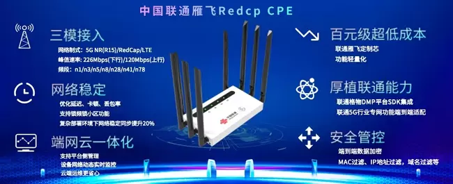 聚焦当前CPE设备在多模接入、成本高、部署复杂及维护难等方面的行业共性问题,联通数科依托定制RedCap芯片和模组能力,重磅推出雁飞RedCap CPE,实现性能、覆盖、成本、安全的全方位升级,树立RedCap CPE产业化标杆。