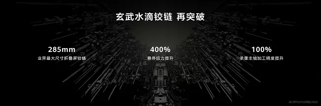 HUAWEI MateBook Fold 非凡大师为确保整机轻薄与坚固性,选择了难度更大的水滴型转轴技术路径,并通过一根主轴和三段式转轴的设计,带来目前业内最大尺寸、最薄且技术复杂的折叠转轴。