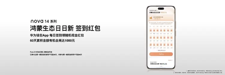 华为还为nova 14系列用户准备了日日新签到好礼:5月23日起,nova 14 系列的用户可在华为钱包每日签到打卡,领随机红包,有机会获取最高1000元权益礼包,持续享受生态进化红利。Pura X上的签到红包活动也将于5月28日继续开展,之前已经参与过第一期的用户,可以再签到领取30天!