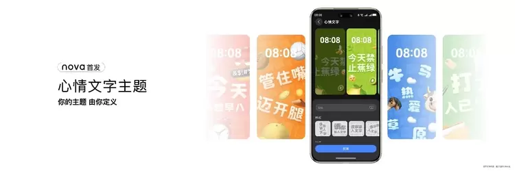 •心情文字主题:华为nova 14系列首发心情文字主题,可随心定义文字、色彩并添加表情包,精致设计融合nova星人的巧思,轻松定义个性主题。