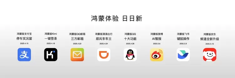鸿蒙5自公测以来,历经30余次系统版本更新,新增系统功能超150项,日均应用版本更新超400个。海量鸿蒙版应用正在飞速迭代,让鸿蒙体验“日日新”。例如在近期,鸿蒙版支付宝新增停车实况窗,出行停车更无忧;鸿蒙版Kimi上线一键登录和深度搜索功能;鸿蒙版QQ邮箱全新支持三方邮箱登录,一个App即可管理多个邮箱;鸿蒙版QQ重磅升级,一次更新十大功能;鸿蒙版滴滴出行新增顺风车车主功能,随心接单自由出行;鸿蒙版微博上线AI智搜能力,方便用户高效又全面地了解各类“新鲜事”;鸿蒙版飞书适配键鼠操作,重构办公体验;鸿蒙版京东首页等多频道全新升级……在光速进化、一日千里的鸿蒙应用市场,nova星人每天都能发现不一样的鸿蒙应用,为生活增添更多新鲜感。