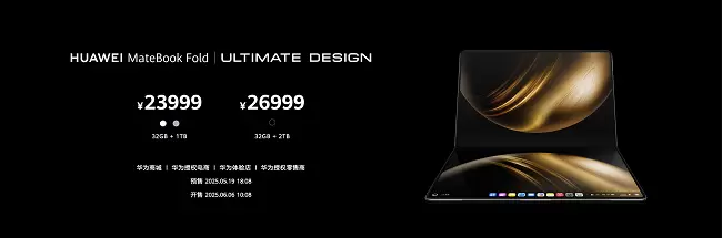 售价方面,HUAWEI MateBook Fold非凡大师新品提供2个配置可选,其中32GB+1TB版本售价23999元、32GB+2TB版本售价26999元。5月19日18:08开启预售,6月6日10:08在华为商城/华为授权电商,华为体验店/华为授权零售商平台全面开售。