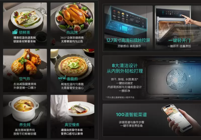 在核心技术方面,产品配备德系双重蒸汽系统与3D热风技术,形成上下循环、包裹式均匀加热,保障菜品外酥里嫩、色香味俱全。同时,精准控温系统将蒸制温度控制在±2°C以内,烘烤精度达±4°C,有效减少温差对食材质感的影响。空气炸技术更实现了高达98.8%的减脂率,在成就口感的同时也兼顾了健康需求。
