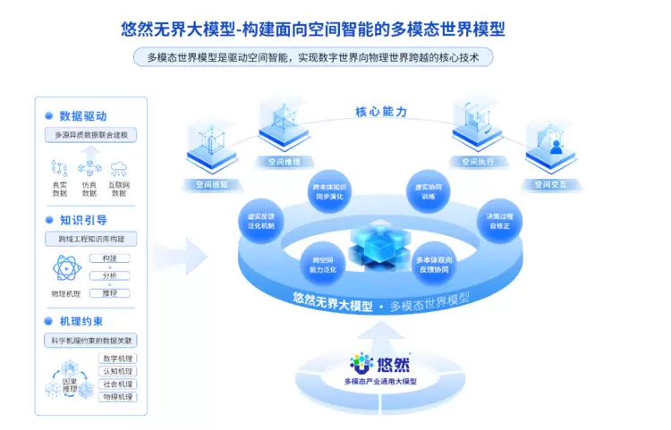 悠然无界大模型之所以能“无界”,在于其打破了空间、任务与本体的固有边界:它能够同时感知和理解数字空间、物理空间与社会空间,实现空间上的无缝联通;具备跨模态的泛化能力和通用性,支持感知、决策、控制等多种任务的统一处理,实现任务上的通用适配;同时具备强大的抽象与迁移能力,能够跨越不同智能体与系统架构之间的差异,实现本体上的协同与共享。三重维度的融合突破,使悠然无界大模型成为构建泛在智能的核心基础。