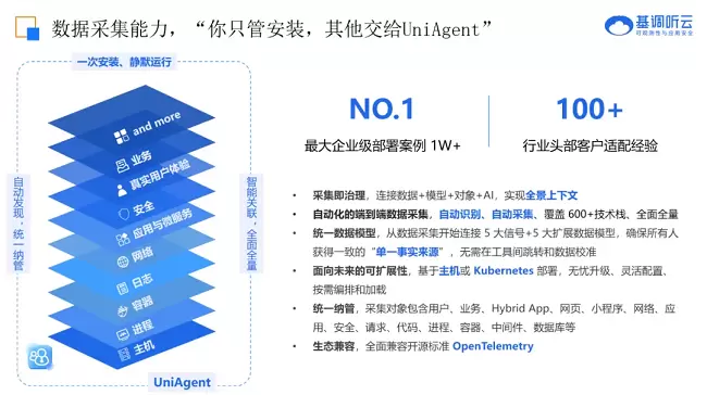 他指出,传统监控工具常面临数据标准不统一、数据孤岛效应及数据清洗难等问题。为此,基调听云基于 UniAgent 实现全栈数据采集,通过 OTLP 协议标准化及大模型智能化,统一管理日志、指标和链路等多元数据,打破传统监控系统的数据孤岛问题。