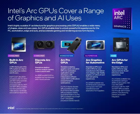 ·全新英特尔锐炫™Pro B系列GPU:英特尔锐炫Pro B60和英特尔锐炫Pro B50 GPU,搭载了为AI推理和专业工作站量身定制的配置,扩展了英特尔锐炫Pro产品系列。