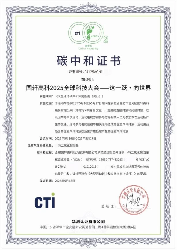 作为科技创新的践行者,国轩高科将绿色发展理念深度融入大会全流程。大会严格遵循《大型活动碳中和实施指南(试行)》,通过全链条减排措施与闭环式碳中和管理,最终获得CTI认证碳中和证书,为国轩高科在大型活动低碳化运营上增添亮眼成绩。