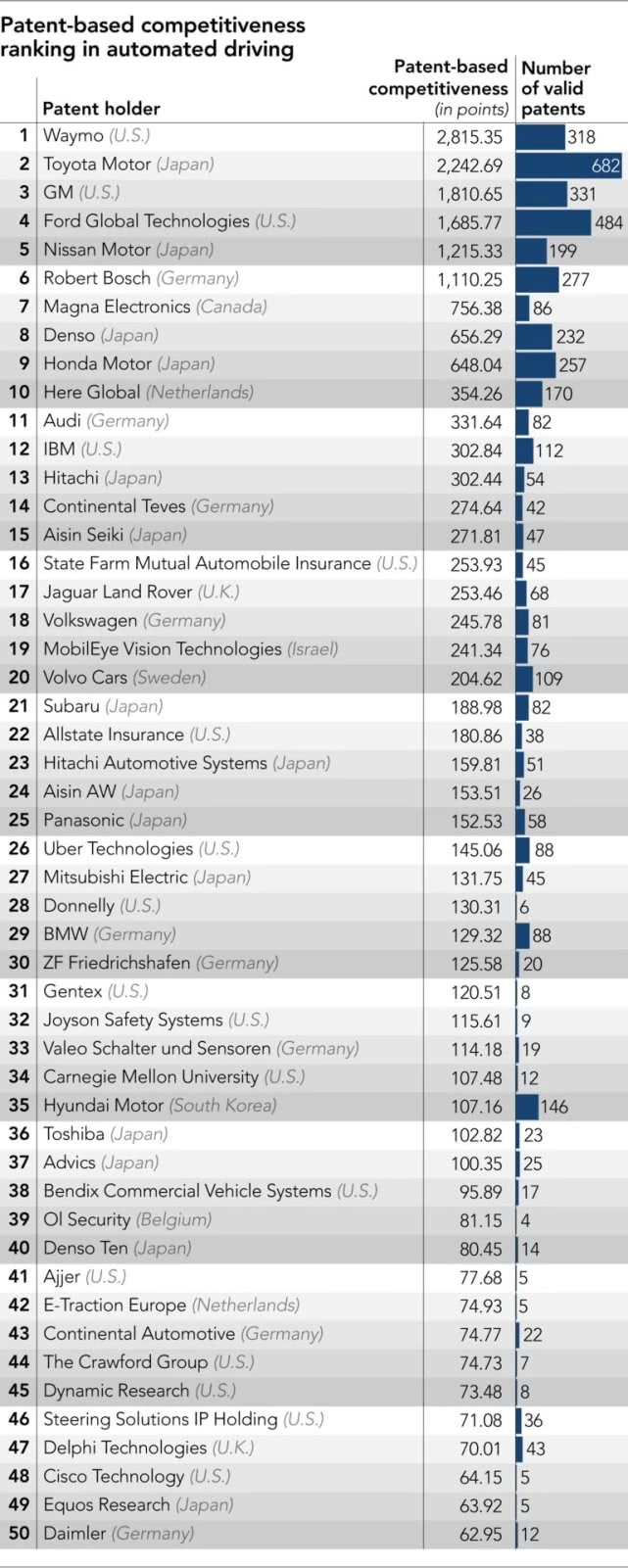 在这个排行榜上,中国汽车公司没有进入前50强,尽管它们也在努力开发无人驾驶技术。中国公司最近才开始申请专利,因此它们被竞争对手指责专利无效的次数和在先进科技报告中专利被提及的次数均不敌西方公司,这影响到了它们的整体得分。