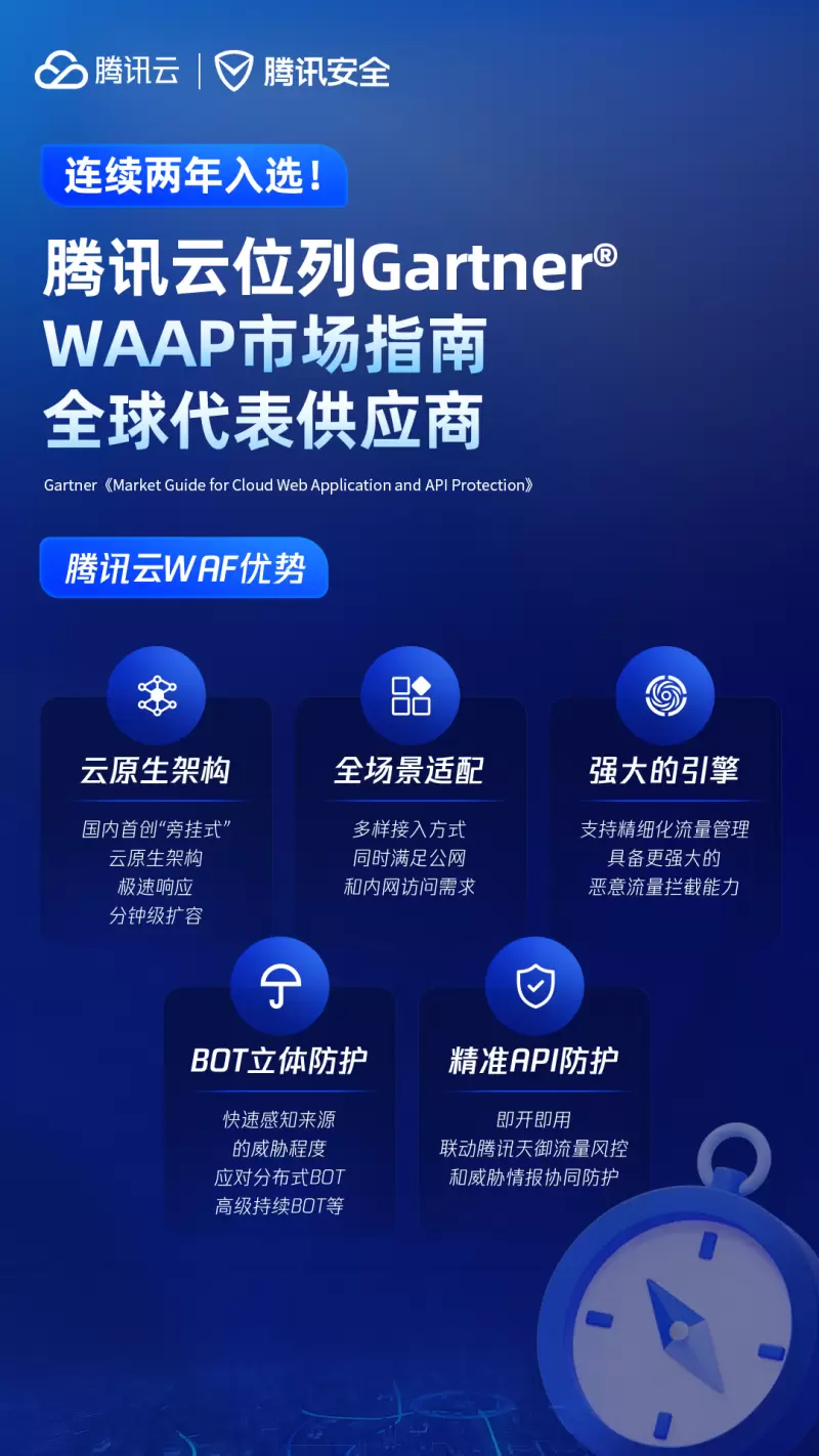近日,Gartner®发布《Market Guide for Cloud Web Application and API Protection》报告(以下简称“报告”),腾讯云凭借旗下WAF产品入选代表厂商,这是腾讯云连续第二年入选该指南。