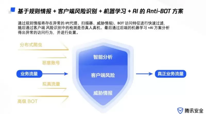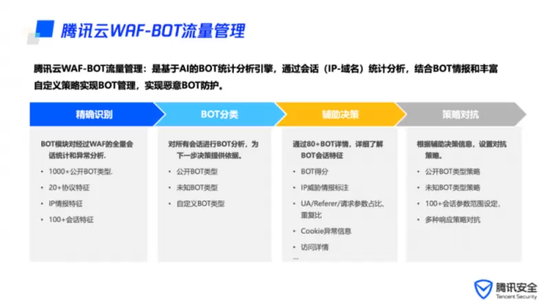 腾讯云WAF为企业打造了基于AI+规则情报+客户端风险识别+机器学习的一站式Anti-BOT方案,通过规则情报将存在异常的IP(代理、扫描器、威胁情报)、BOT访问特征进行快速过滤,随后通过客户端风险识别中的检测是否真人真机,最后通过后端的机器学习+AI方案分析得出异常的访问行为,并进行处置,为企业构筑多层次、体系化的BOT检测响应防线。在实战中,腾讯云WAF准确拦截异常流量达99.9%。