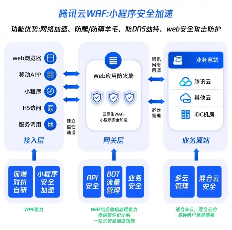 值得一提的是,腾讯云WAF支持SaaS、CLB和混合云等多种云原生接入方式,其中国内首发的创新性“旁挂式”云原生架构CLB-WAF,具有无需修改域名解析快速接入、延时低、对业务无改动、快速应对突增流量,稳定性高等特点,可以保证业务安全能力快速上线。同时,腾讯云WAF在BOT管理、API安全、小程序安全加速等场景具备独特的能力优势。