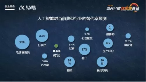 在这张图里面我们可以看到,老师和心理医生是最难被替代的职业,因为教书育人这种工作,永远也不可能用机器去完全替代。我在和很多教育方面的专家沟通时,他们自己也说,现在机器很难替代老师,但是现有的很多老师如果不进行改变的话,他可能未来还是会被替代掉,做更好的老师,也要看他如何更好地培养未来的人才,怎么更好地和现有的技术去融合。