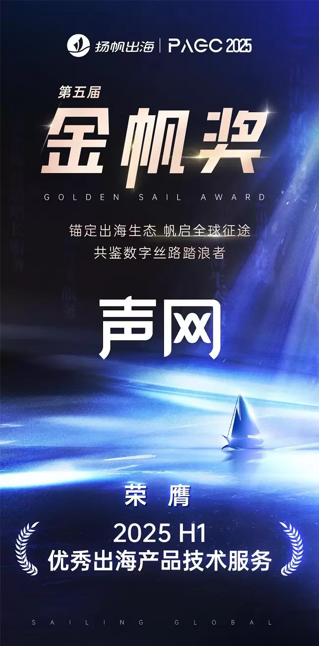 由扬帆出海主办的第五届全球产品与增长展会(PAGC2025)今日在广州举办,作为大会的重要组成部分,第五届金帆奖颁奖典礼同步举行。声网凭借优秀的产品技术能力,以及多年来在出海领域的持续耕耘赋能,蝉联金帆奖「优秀出海产品技术服务」奖项。