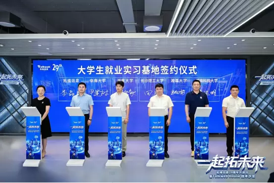 同时,拓维信息与中南大学、湖南大学、湘潭大学、湖南科技大学、长沙理工大学举行签约仪式,共建“大学生就业实习基地”,通过“产学研用”联动,系统化培养引领“AI+鸿蒙”发展的实战型人才,为大学生创业就业引路、护航。