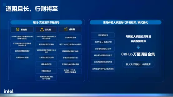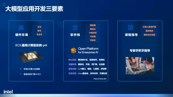 这也就引申出了大模型应用开发的三要素:第一是硬件环境,用于验证和练习;第二是软件栈,需要主流的软件栈支持;第三则是由浅入深的指导课程,不仅能够运行,更要深度理解,真正实现能力的进阶。而英特尔与火山引擎合作的初衷,就是为开发者们打造一把低门槛的梯子,帮助更多人迈出跨越的第一步。