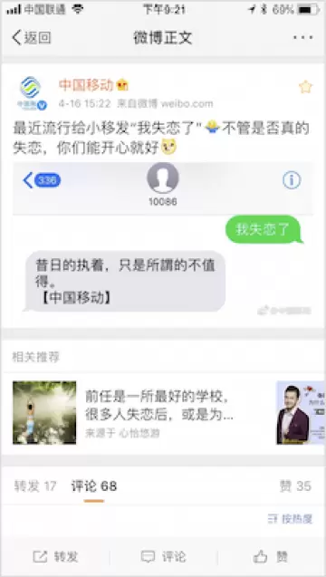 中国移动官方列举的案例为,当用户给10086发送短信“我失恋了”后,会收到“昔日的执着,只是所谓的不值得。【中国移动】”的文字回复来获得安慰,移动方面表示只要用户开心就好。
