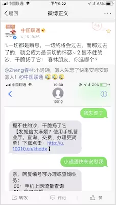 随即,中国联通也转发了一名用户发出的类似内容,其中显示当用户向10010发送“我失恋了”后,会收到含有“握不住的沙,干脆扬了它”字样的回复。