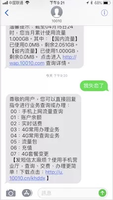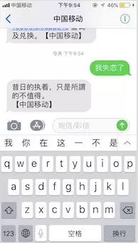对此,坐标北京的作者专门怀着好奇心进行了尝试,结果却有所不同。向移动、联通两家运营商的号码发送“我失恋了”后,却仅移动10086出现了“昔日的执着,只是所谓的不值得。【中国移动】”的回复,联通10010却仅回复了常规的业务指令提示信息,并未出现任何智能化回应。