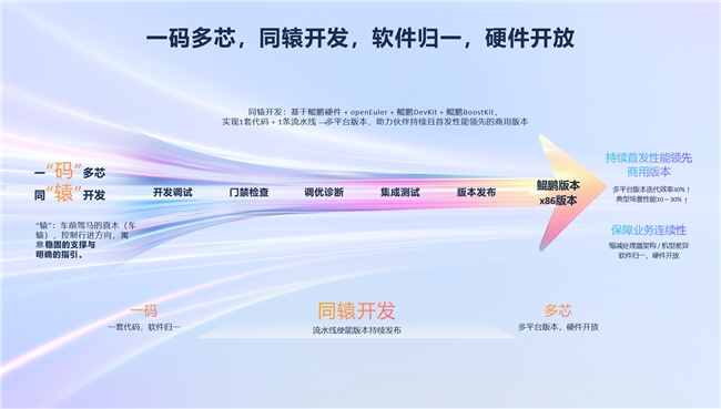 去年,鲲鹏开发流水线正式发布,今年,我们将鲲鹏开发升级到了“一码多芯,同辕开发”。鲲鹏同辕开发,通过开发流水线、工具和加速库的合作,实现缩减鲲鹏/x86架构及机型的开发差异,一套代码、软件归一;多平台版本发布,硬件开放,提升客户和伙伴业务应用的竞争力和连续性。