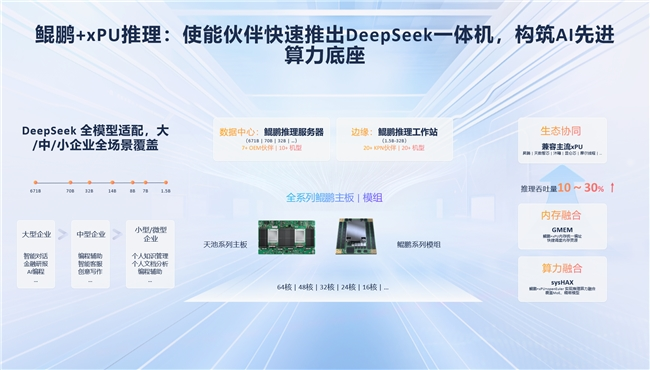 鲲鹏与DeepSeek深度融合,基于“鲲鹏+xPU”组合,构建高安全、低TCO的AI算力底座,为企业提供更灵活组合的智能化底座。鲲鹏提供全系列主板和模组,目前已经有7家OEM伙伴已经推出10余款推理服务器,20余家KPN伙伴推出了20余款边缘推理一体机/工作站,覆盖数据中心和边缘场景,适配昇腾等主流xPU,做到生态协同。
